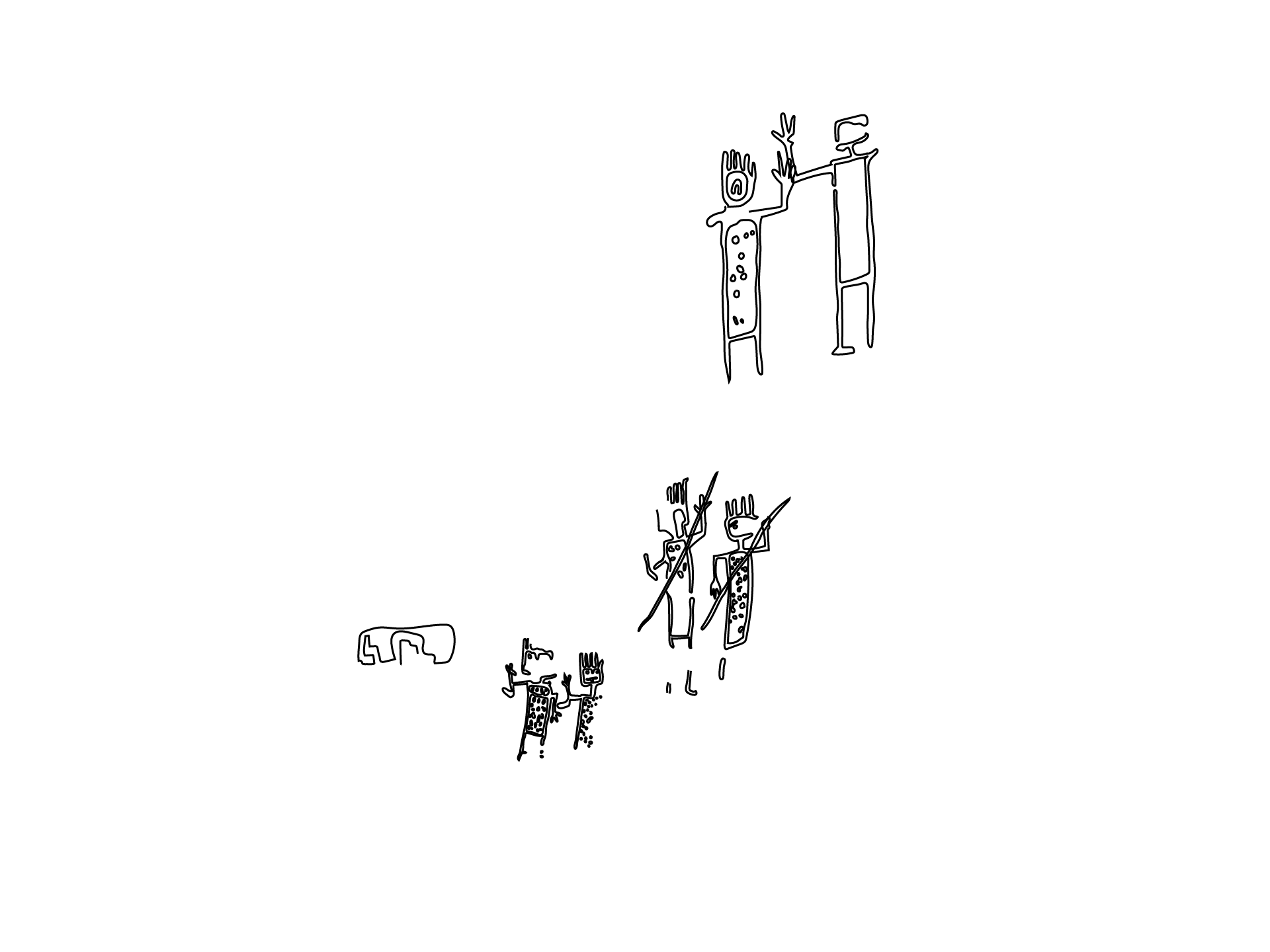 Las seis figuras antropomorfas miden entre 1 y 4 metros de alto y están dibujadas de pie y en parejas sobre el panel de ignimbrita, son cuerpos humanos rectangulares con trazos rectilíneos que poseen túnicas con patrón moteado que emula la piel de ciertos felinos existentes en el aérea andina que simbolizarían el poderío de estos animales.